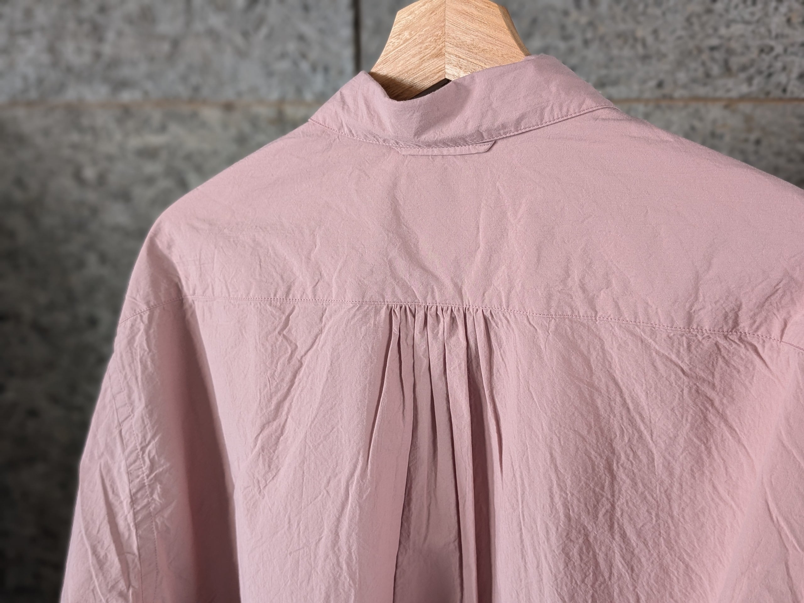 ややオーバーサイズに作られたシルエットで、小さめのレギュラーカラーシャツ。