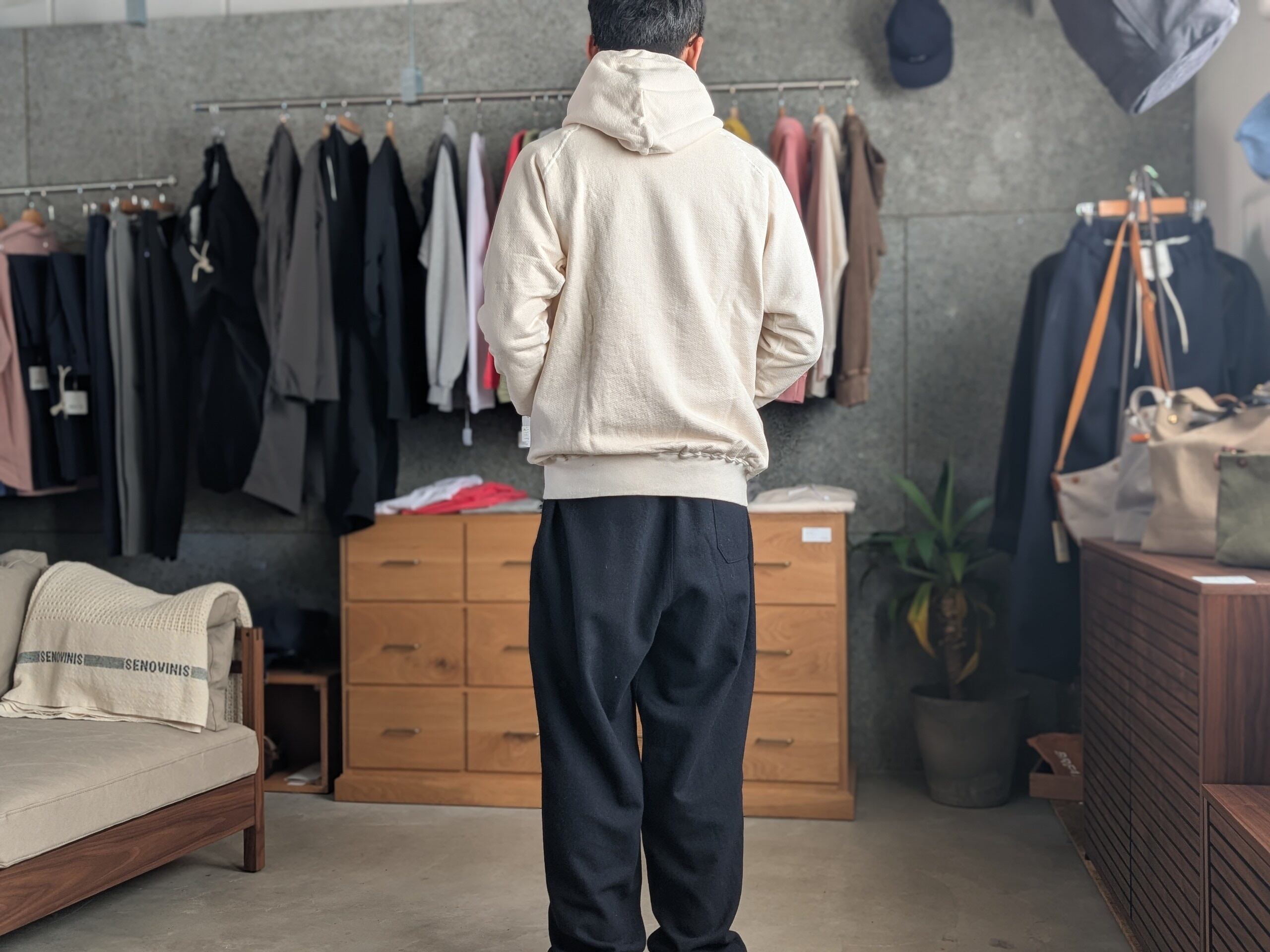 動きやすさ、見た目のスマートさにこだわり、スウェット特有の野暮ったさを解消。染色による縮率を計算し、後染め加工後にベストな形に仕上がるように仕立てています。