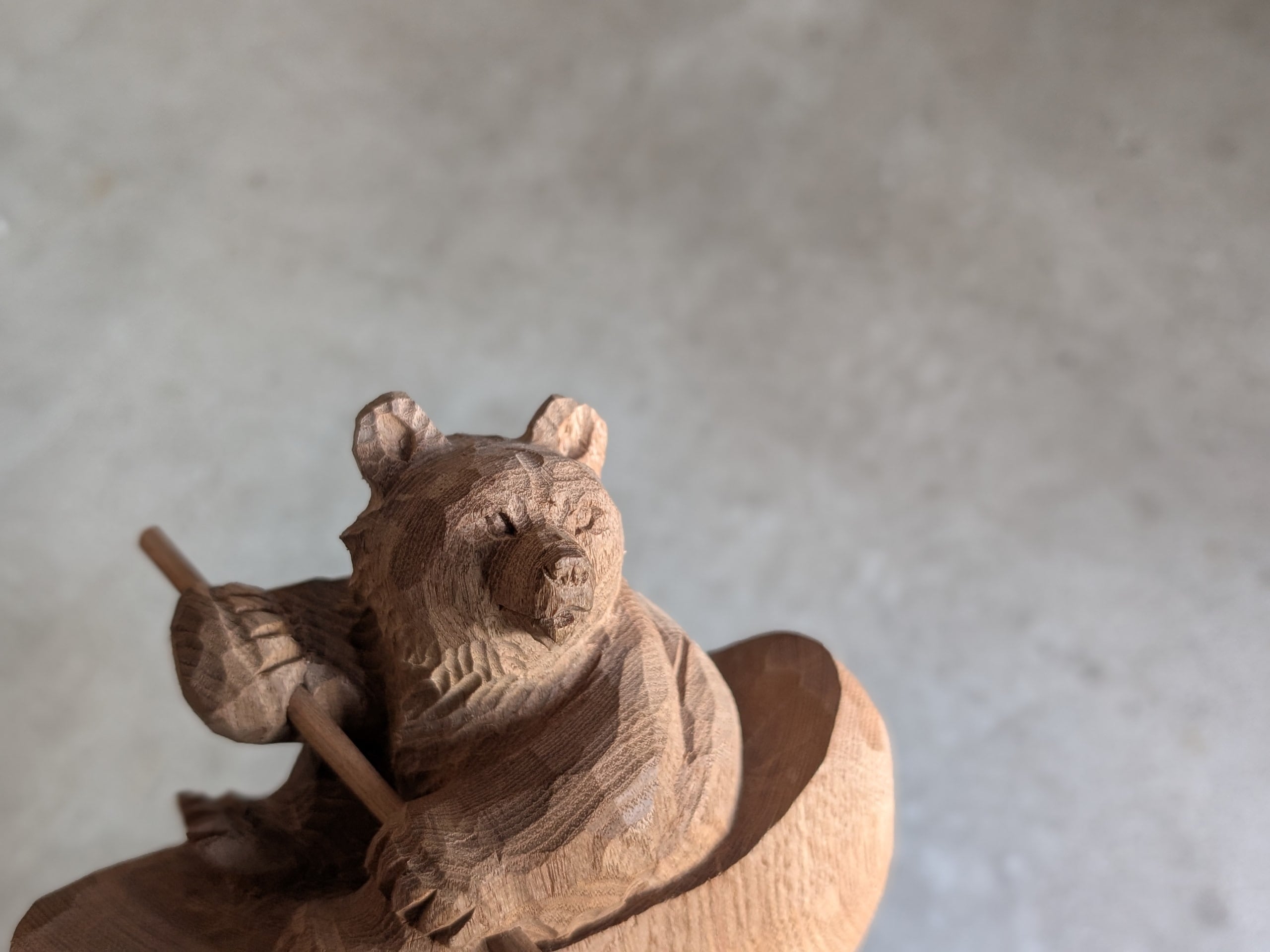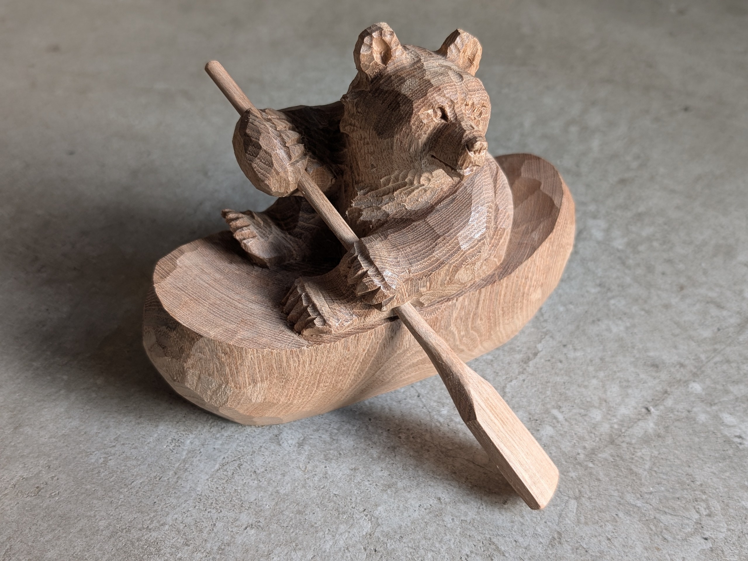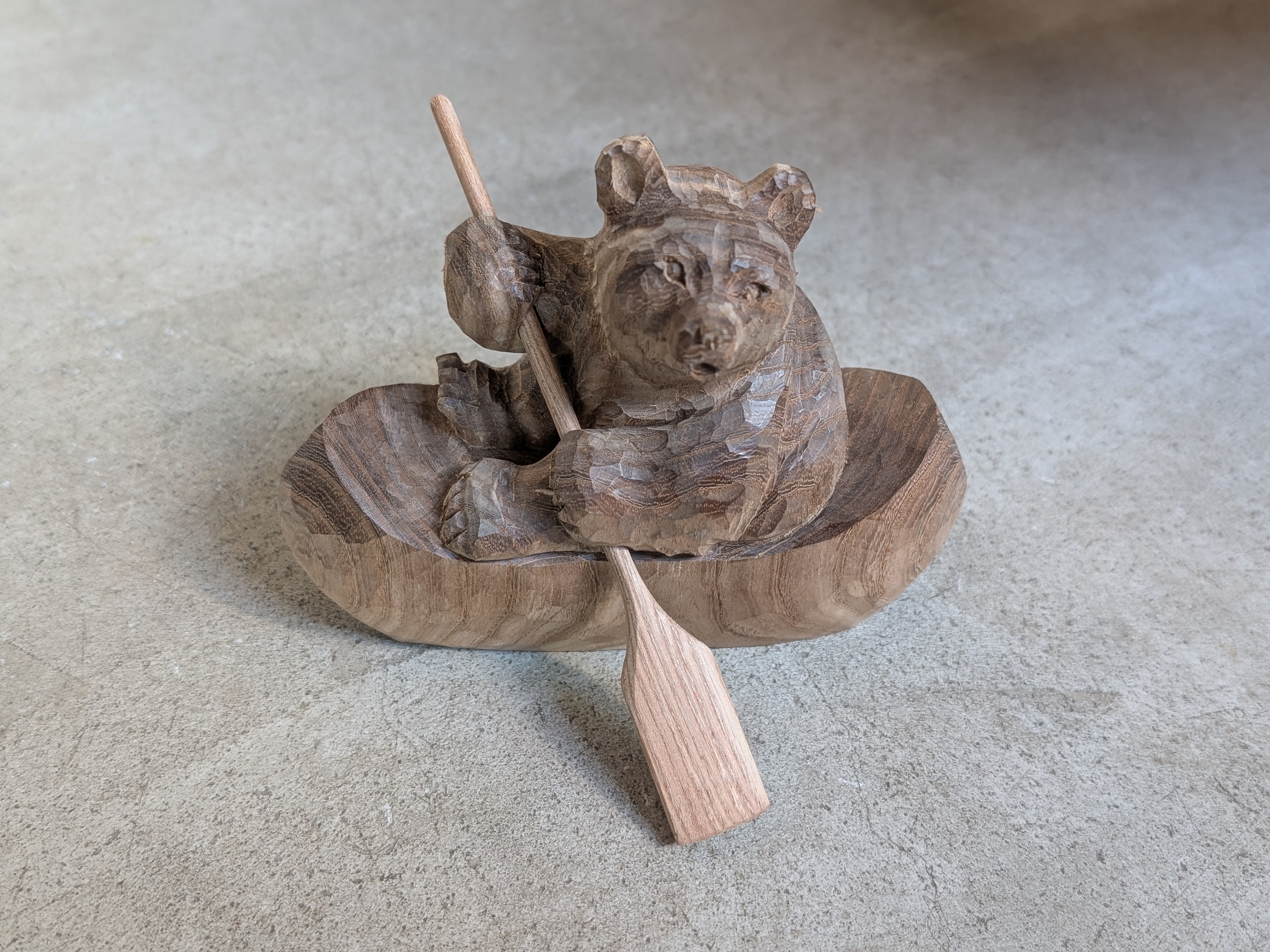 大自然の中でカヌーをする熊がいたって不思議ではない。そんな地域性を取り込んだ木彫り熊です。