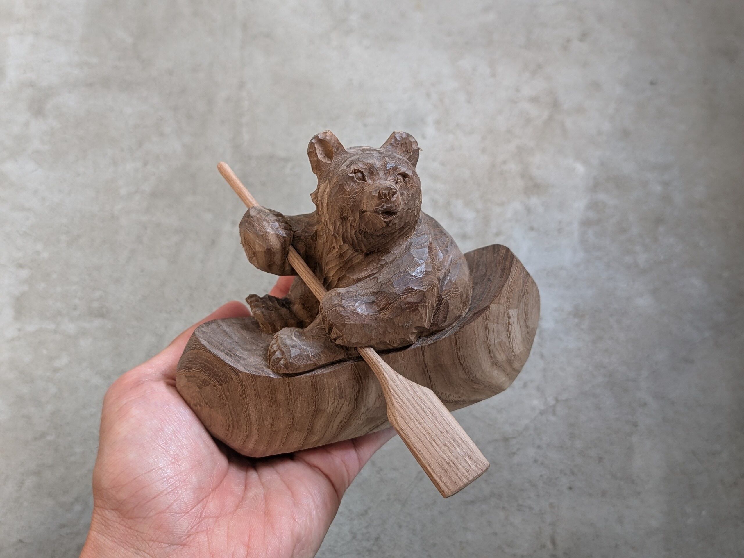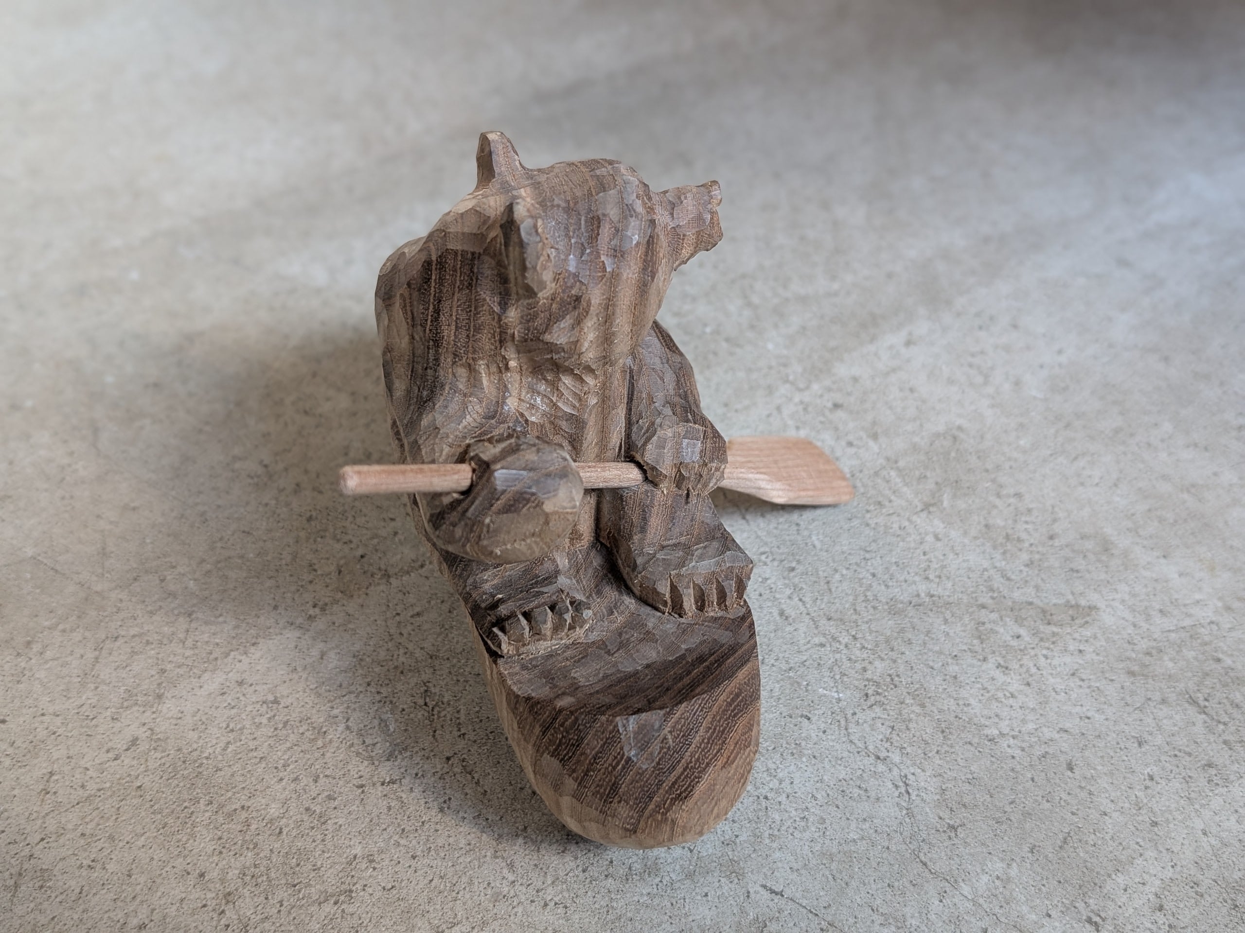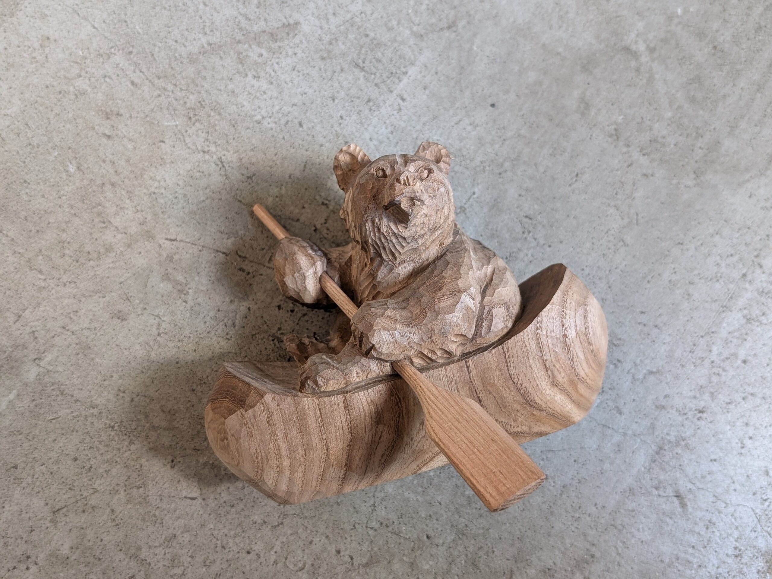大自然の中でカヌーをする熊がいたって不思議ではない。そんな地域性を取り込んだ木彫り熊です。