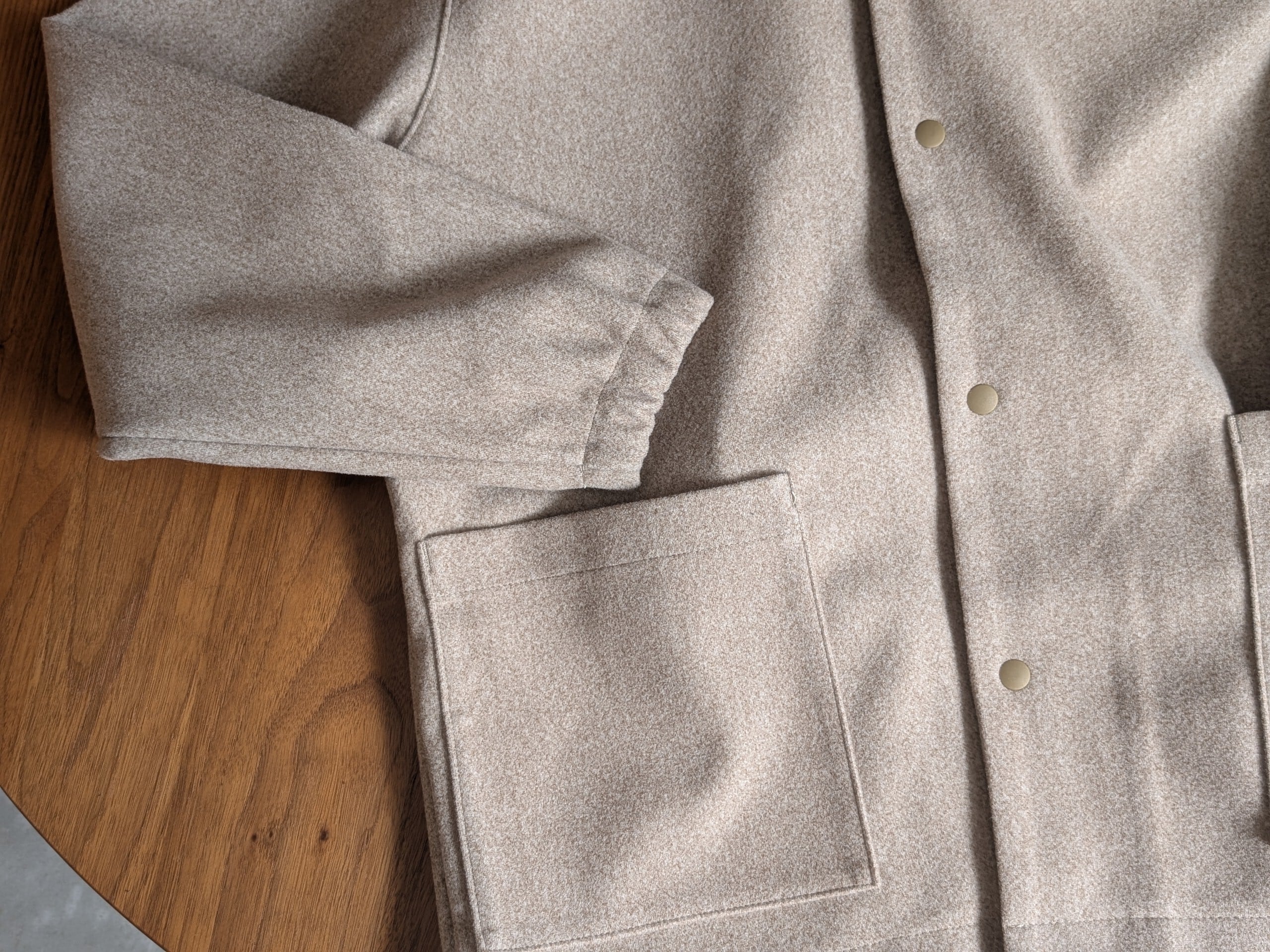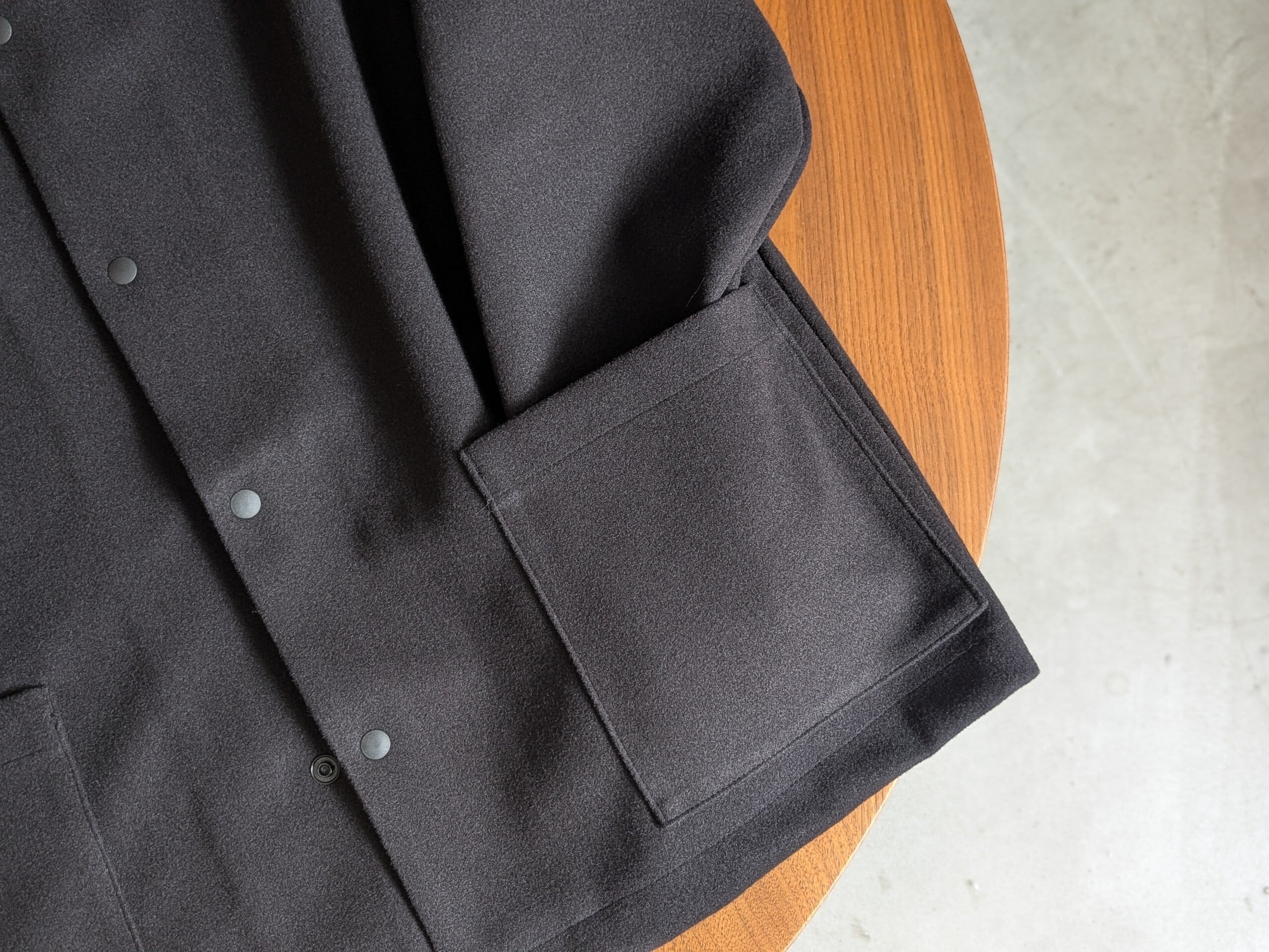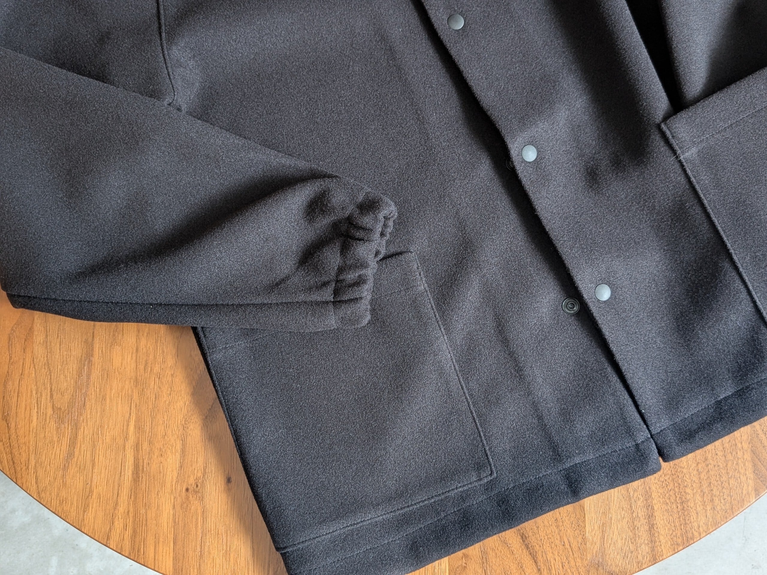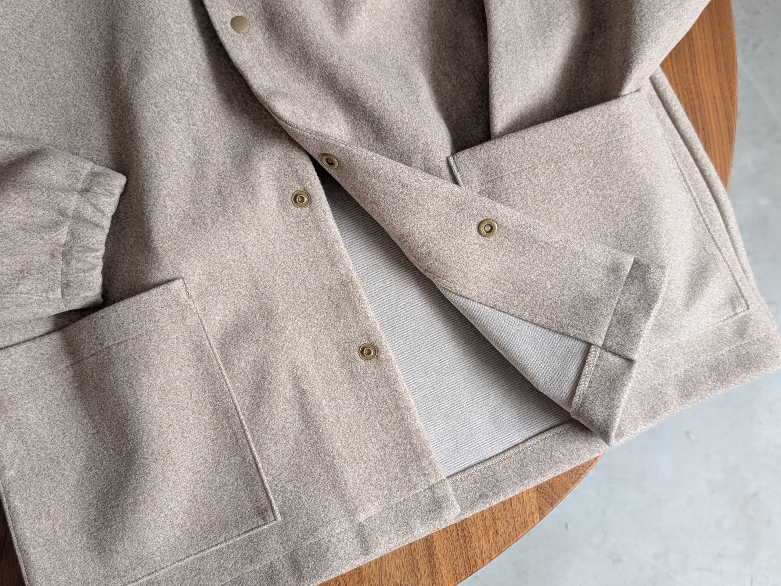 襟のないデザインディテールが、コーディネートの幅を広げてくれます。袖口はゴム仕様です。