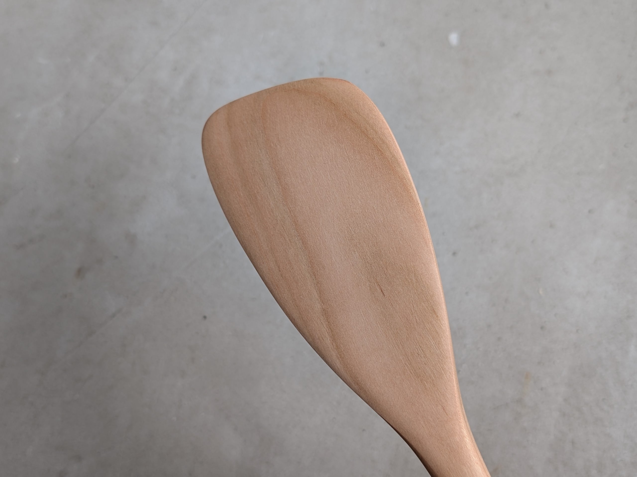 広島県産のヤマザクラをくり抜き、無塗装で仕上げたヘラは、ほんのり木の香りがして落ち着きます。無塗装なので安心、安全、鍋も傷つけません。また先端が溶けるなんて心配もありません。