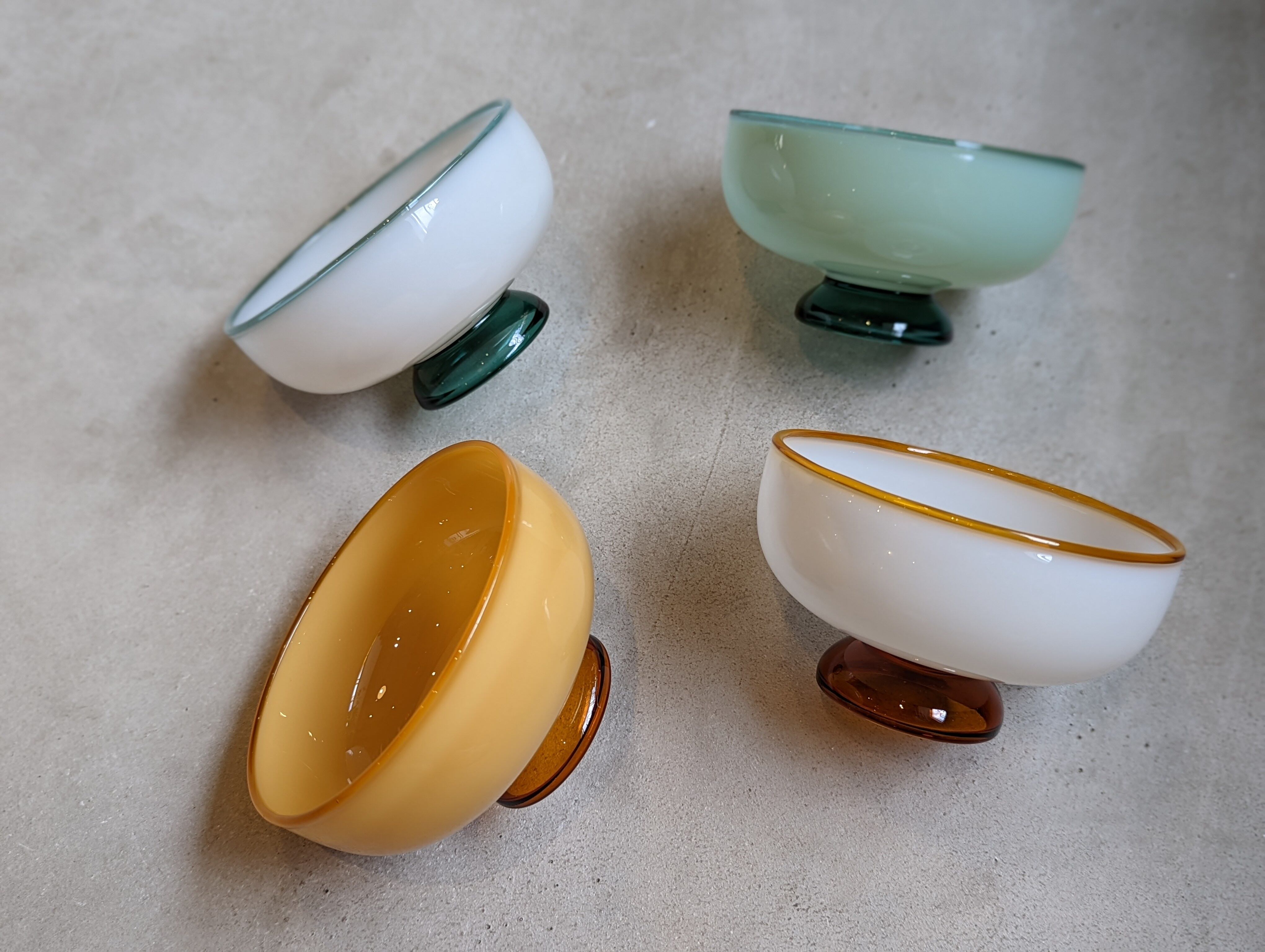ミルクガラスに、透明ガラスのフチと高台を組み合わせています。