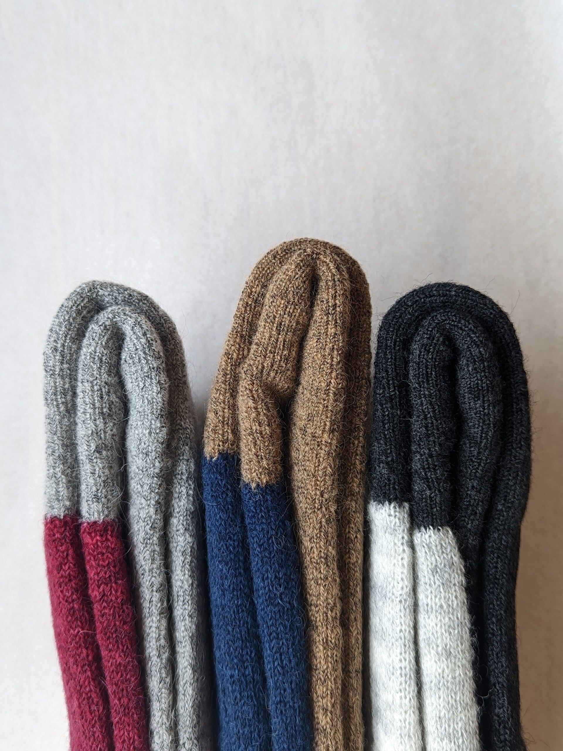 モヘヤの特徴は柔らかで保温性が高く、ウールとブレンドすることで薄手でも温かな靴下に仕上がります。