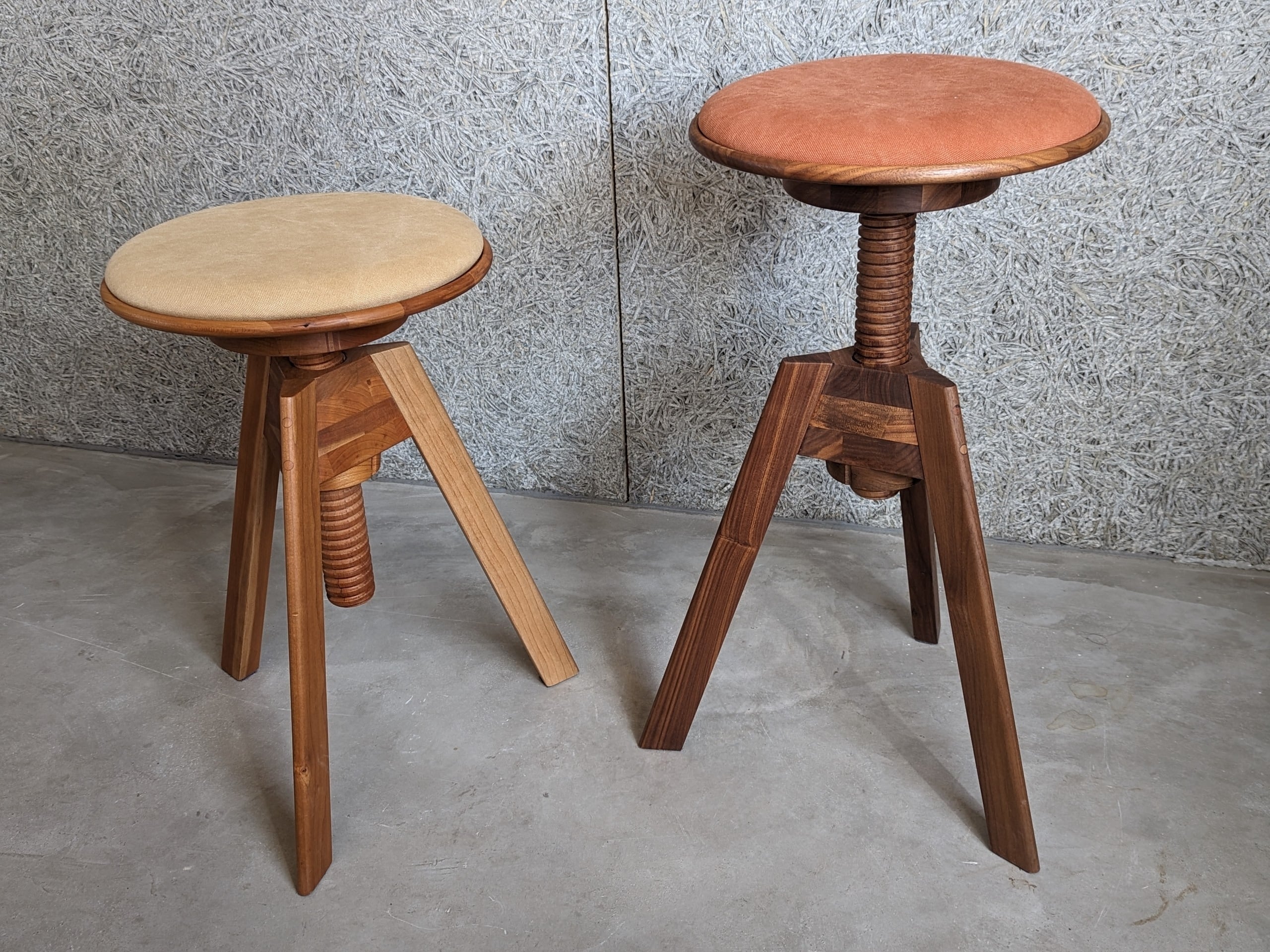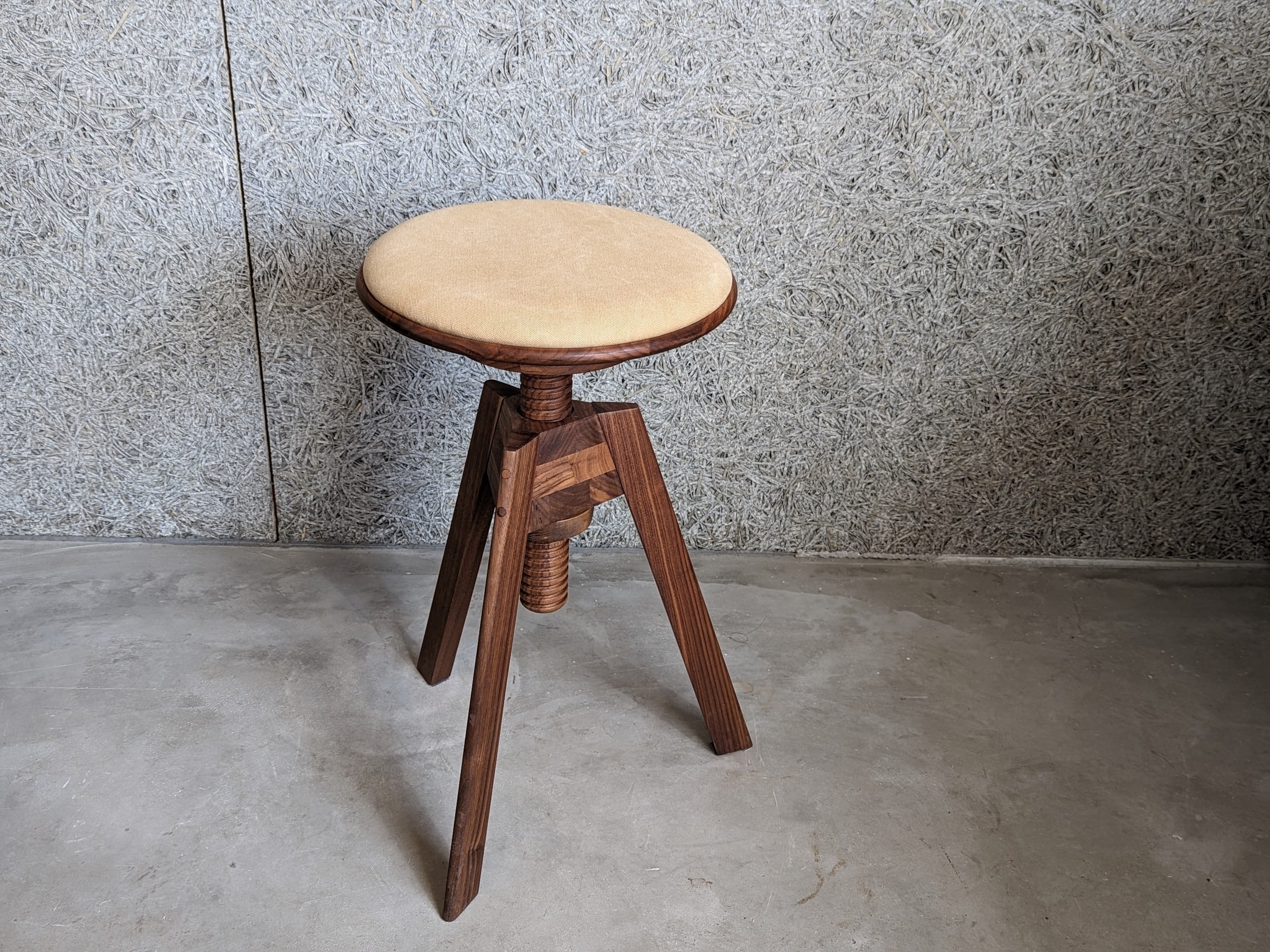 座面を回転させることで高さを変えられる昇降式スツールです。