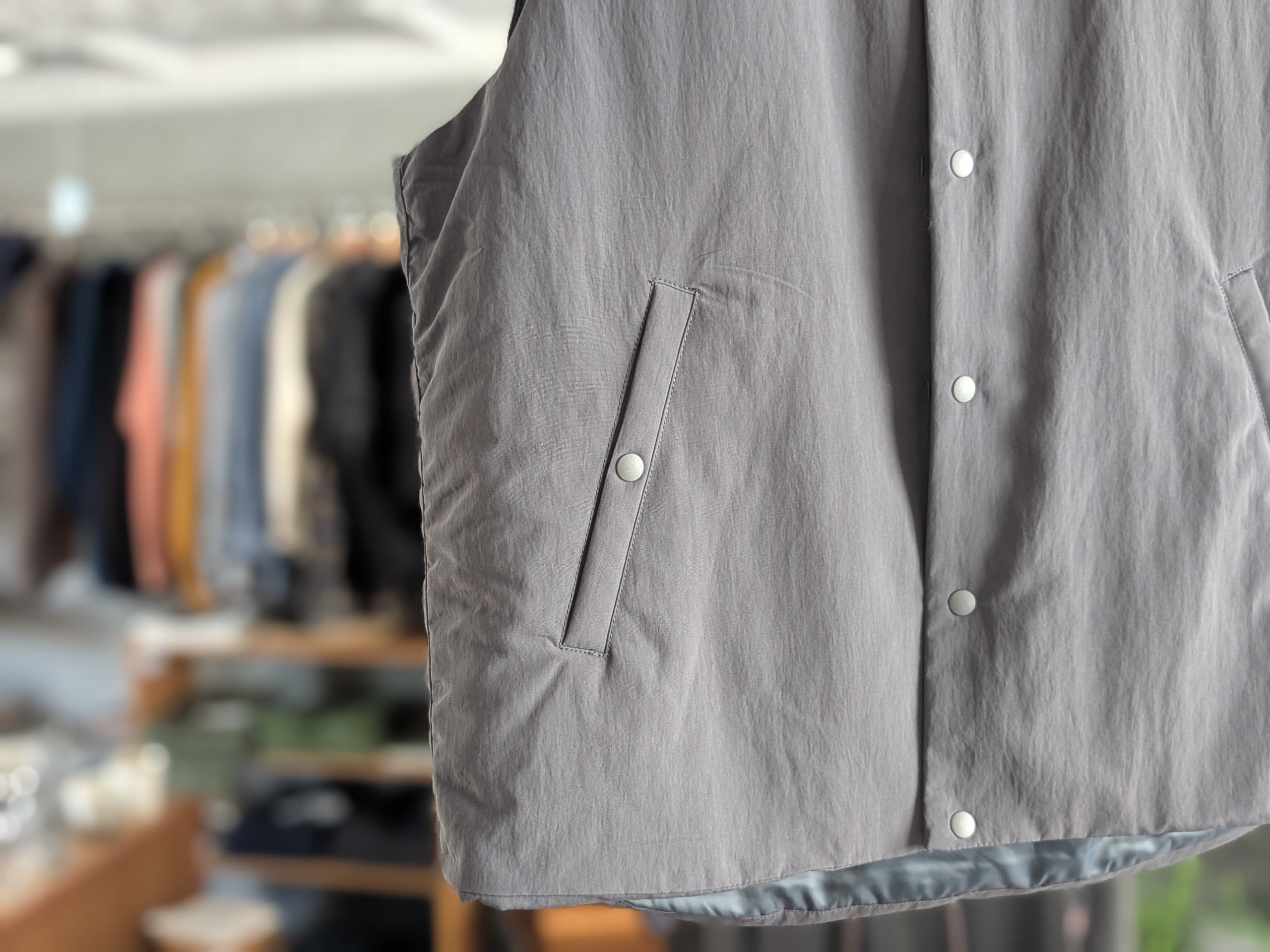 程よい厚さの中綿が入ったナイロン生地のベスト。